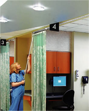 Con un simple giro de la varilla de 1,2 m (48”), los empleados pueden bajar la cortina de privacidad para lavarla y colocar cortinas limpias fácilmente sin necesidad de usar escaleras.